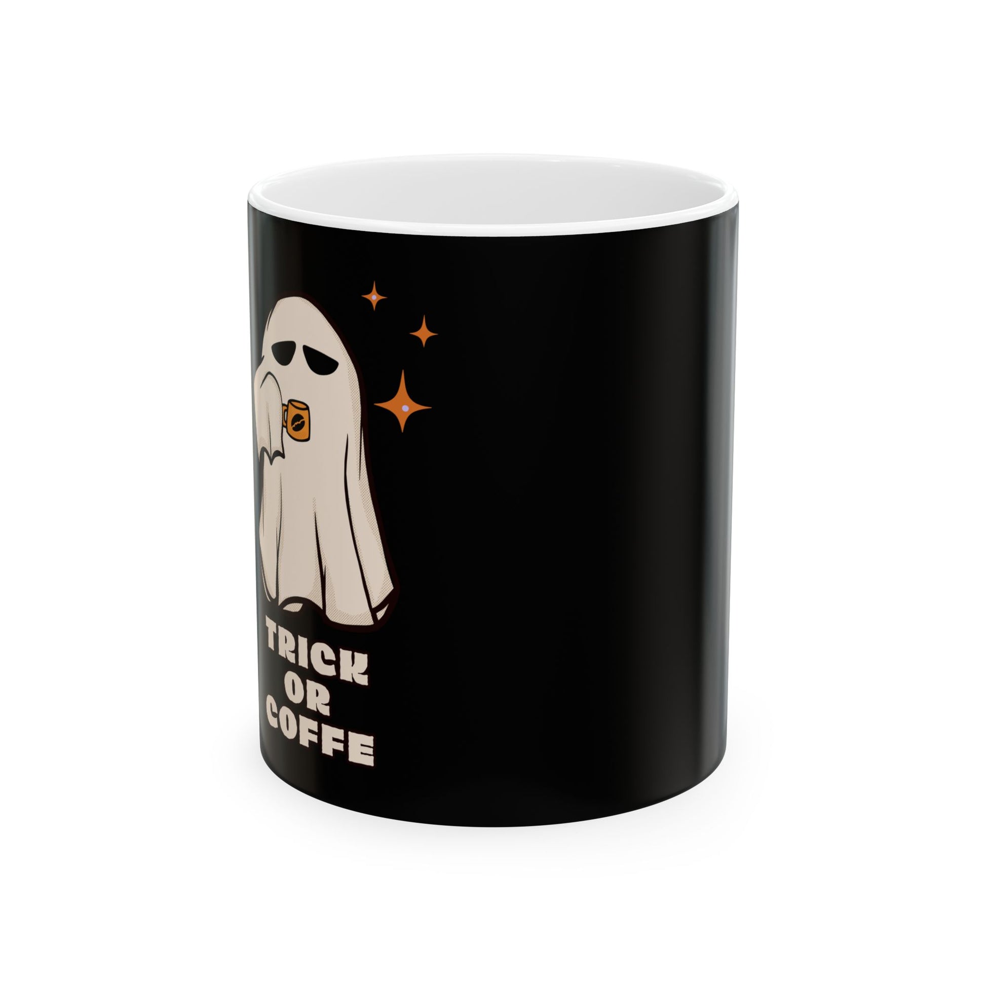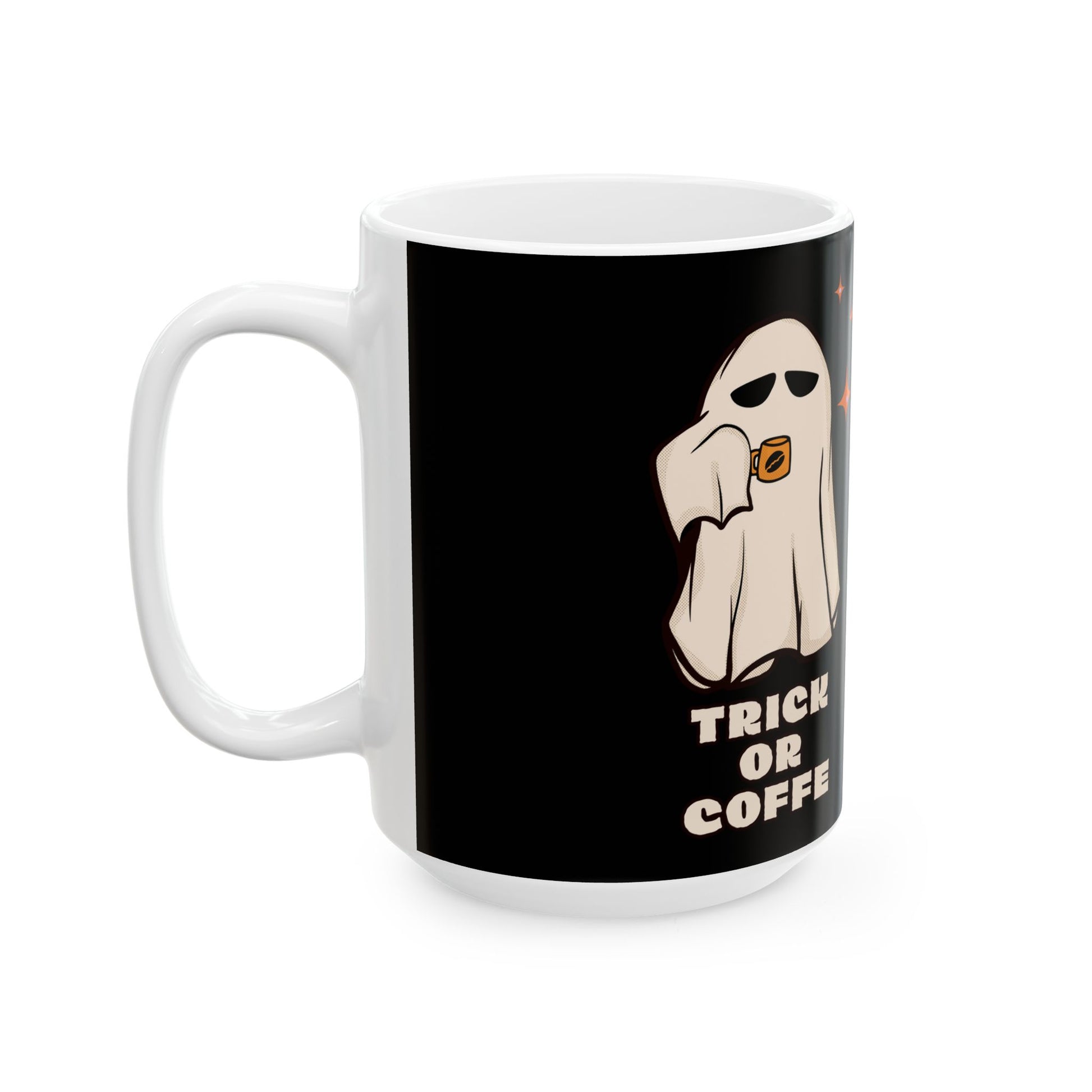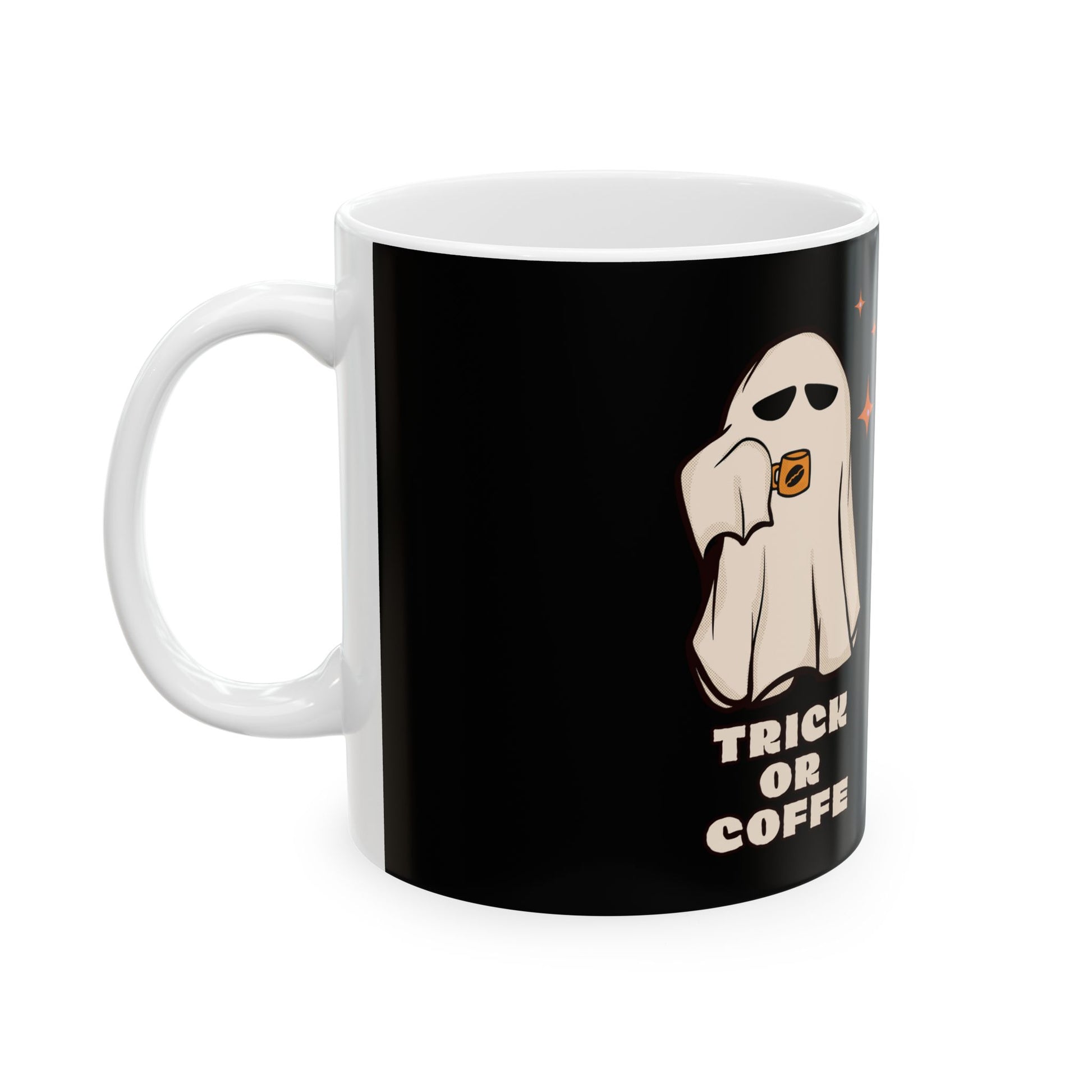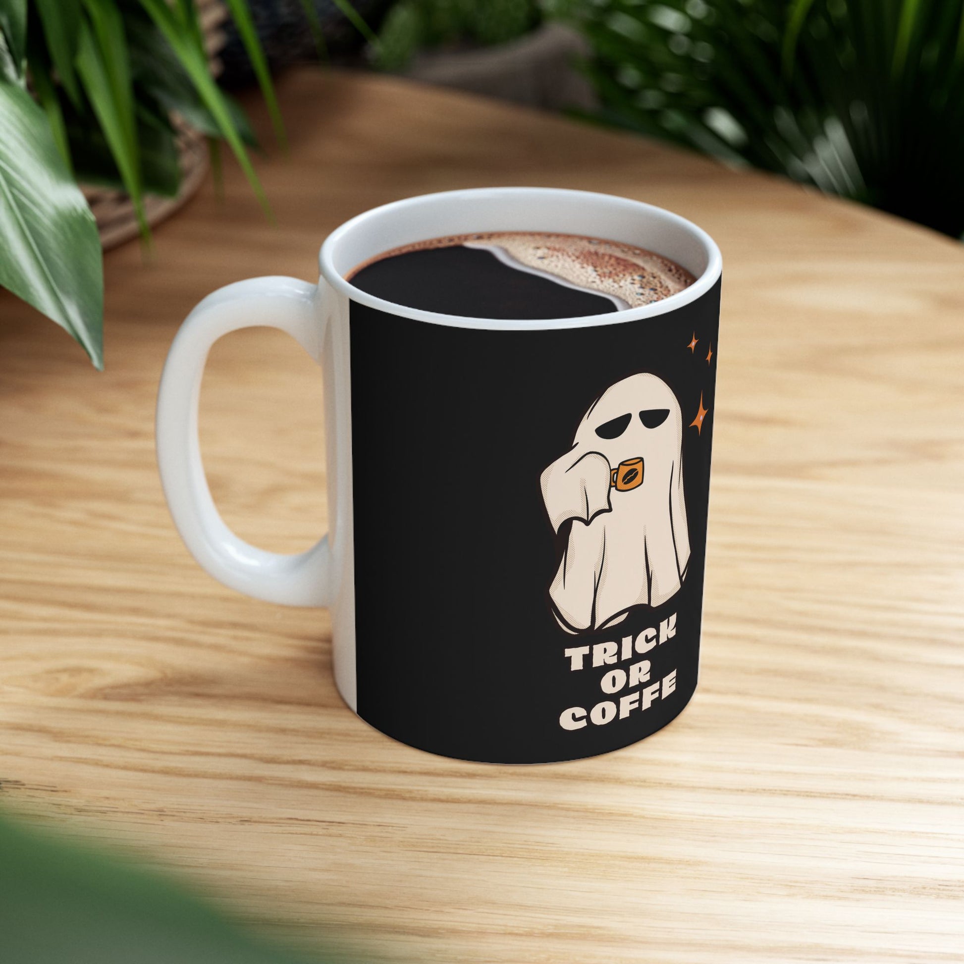 Ghostly Trick or Coffee Ceramic Mug - SpookyHalloween Mug, Coffee Cup, Halloween Gift, Fun Drinkware, Black & White Mug