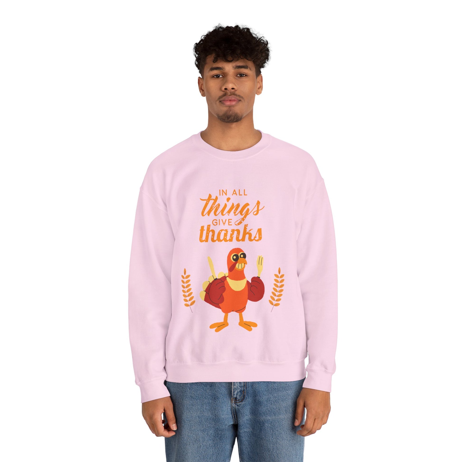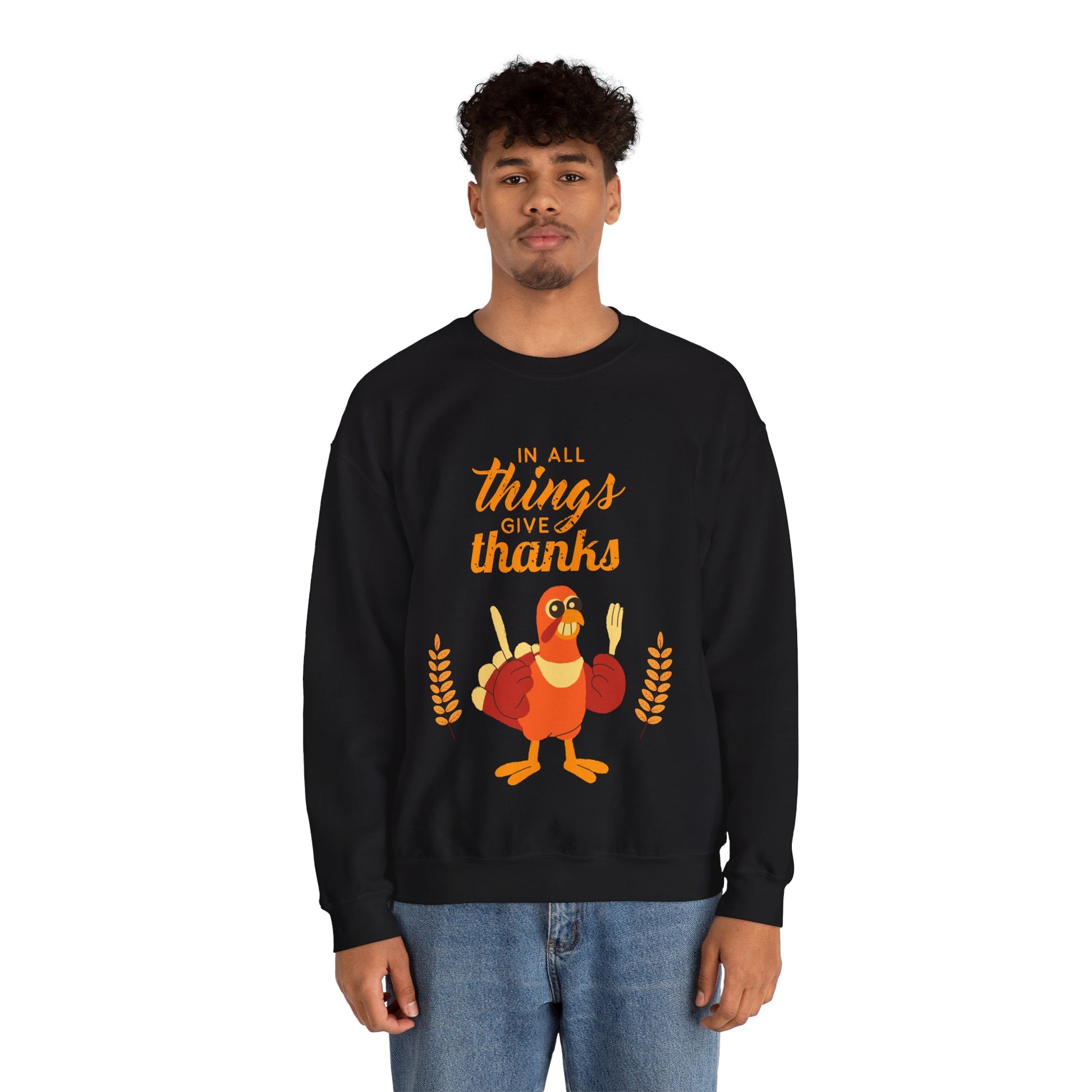 Introducing a cozy Unisex Heavy Blend™ Crewneck Sweatshirt, perfect for celebrating gratitude and togetherness. This sweatshirt, featuring a delightful turkey graphic and the uplifting message "In all things give thanks," evokes a warm, inviting atmosphere. Ideal for Thanksgiving gatherings or cozy nights by the fire, it effortlessly blends comfort and style for those who cherish community and family moments. Whether you're entertaining guests or enjoying a quiet evening, this sweatshirt complements every scenario. It's a thoughtful gift for friends and family who appreciate comfort with a heartfelt message during the fall season, making it an excellent choice for Thanksgiving, Friendsgiving, or any celebration of gratitude.