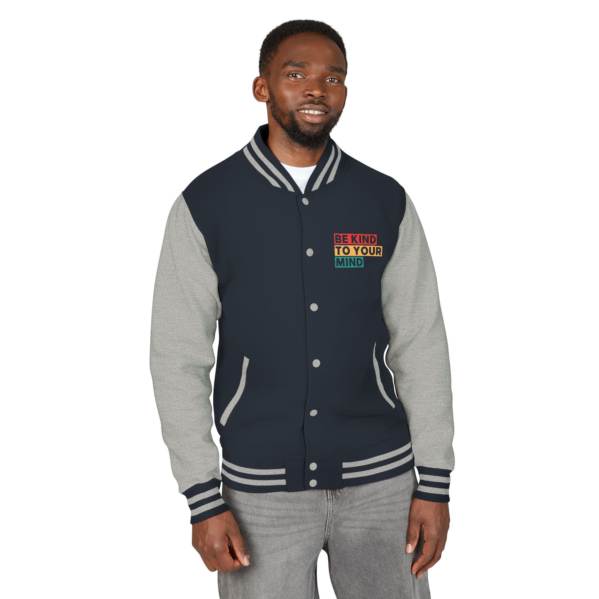 Unisex Heavyweight Letterman Jacket - Be Kind To Your Mind, Gift for Friends, Casual Wear, Sports Events, Everyday Style